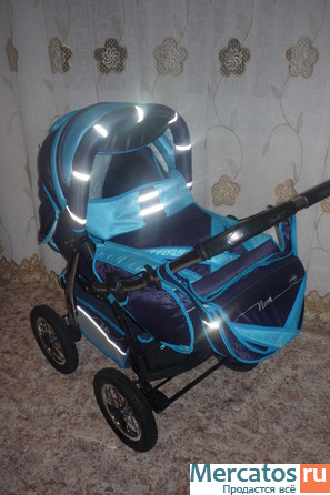 Тип коляска-трансформер, цвет сине-голубой с неоновыми вставками. Конструкция четыре точки опоры, количество колес 4,колеса резиновые, надувные. Ремни безопасности пятиточечные, регулировка наклона спинки. Регулировка высоты ручки , люлька-переноска, с жестким дном. Чехол на ноги, солнцезащитный козырек, корзина для покупок сетчатая, сумка для мамы, москитная сетка, дождевик, есть возможность стирать. Вес коляски (кг.)16. Производство Польша. В хорошем состоянии.