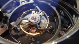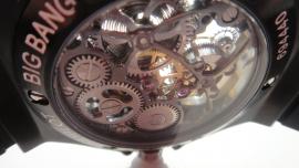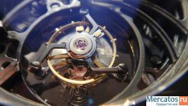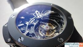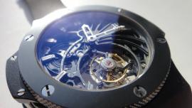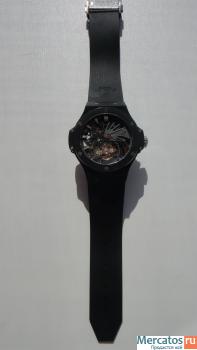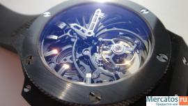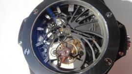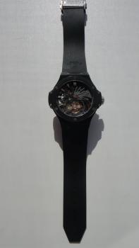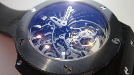 " Big Bang Tourbillon skeleton" от Hublot. Механизм: швейцарский с ручным заводом, Nouvelle Lemania 1874. Функции: часы, минуты, центральный турбийон. Корпус и базель: керамические, (диаметр 44 мм, высота 14 мм), сапфировое стекло с антибликовым покрытием. Циферблат: скелетообразный; продолговатые часовые стрелки. Ремешок: каучуковый ремешок с раскладной застежкой Hublot.