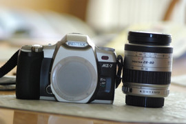 35 мм зеркальная автофокусная фотокамера PentaxMZ-30 отAsahiOptical Сo., Ltd. Удачное сочетание режимов Picture, легкости в управлении фотокамерой и относительно невысокой стоимости делают её прекрасным выбором для новичка. Программные режимы Picture, уже получившие широкую признательность, активизируются простым поворотом переключателя режимов. Большую свободу при выборе экспозиции обеспечивает наличие таких экспозиционных режимов, как режим приоритета диафрагмы АЕ, режим приоритета выдержки АЕ и ручной режим. Среди других полезных особенностей MZ-30 можно перечислить универсальную широкозонную систему автофокуса, автоматический подъём встроенной вспышки и режим уменьшения эффекта “красных глаз”, большую ЖКИ панель, яркий видоискатель с диоптрийной коррекцией и дисплеем полной информации, режим наложения кадров и функцию экспопамяти. Является одной из самых компактных и лёгких зеркальных автофокусных фотокамер. Pentax «MZ-7» — однообъективный зеркальный фотоаппарат. Был рассчитан на 35-миллиметровую плёнку. Производился с 1999 по 2001 год в чёрном и чёрно-серебристом исполнении. В США фотоаппарат известен под названием «ZX-7» и производился в чёрно-серебристом исполнении.Режимы: M(ручной), Av(приоритета диафрагмы), Tv (приоритет выдержки), P(режим программной линии), Auto-Picture, Paction, Pclose-up, Plandscape, Pnight-scene и Pportrait.Встроенный TTL-экспонометр.Экспокоррекция ±3 EV с шагом 1/2 EV.Блокировка экспозиции.Автоспуск — 12 сек.Электронный затвор из металлических ламелей с вертикальным ходом 30 — 1/2000 сек, В.Питание 6 Вольт: 2 элемента CR2. Дополнительно может быть использован батарейный блок «Fg» с 4 элементами AA.Моторная протяжка плёнки с возможностью серийной съемки до 2 к/сек.Обратная перемотка плёнки. Функция может срабатывать автоматически при окончании плёнки или вызываться вручную.Отображение выдержки и положения диафрагмы в видоискателе.ЖКИ-дисплей на верхней панели корпуса.Панорамная съемка. 2000