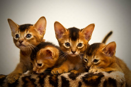 Продаю очаровательных четырех Абиссинских котят яркого дикого окраса от отца чемпиона . Две кошки и два кота . Очень ласковые, воспитанные и игривые малыши. Приучены к лотку и любят лазать по когтеточке, полностью социализированы. Самостоятельно едят (корм, паштет, творог и пьют мамино молоко). Приучены к рукам, любят когда их гладят. Родились 25 июня 2011г. 8-903-224-56-40
