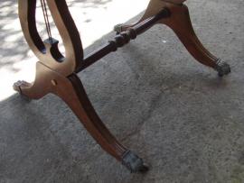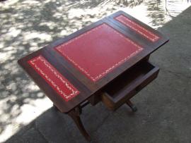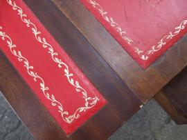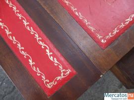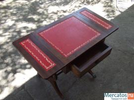 Английский столик отделан тиснённой красной кожей с орнаментом, ножки сделаны в фоме арфы и заканчиваются бронзовыми лапами., на колёсиках. Один выдвижной ящик, удлиняется с двух сторон. Размеры 44х37х54(Н) в собранном виде, 74х37х54см в разобранном виде.