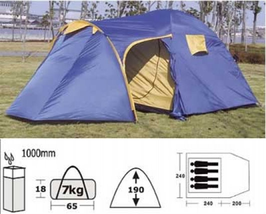 Комфортабельная четырехместная палатка с удлиненным передним тамбуром.