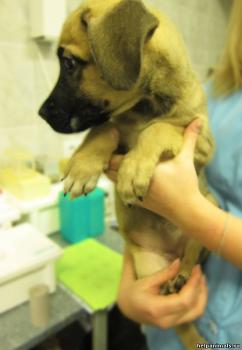 Щенки похожи на помесь со стаффордом, будут среднего размера (40 см в холке).