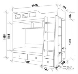 Верхнее спальное место 1950х800мм, нижнее спальное место 1600х800 мм.