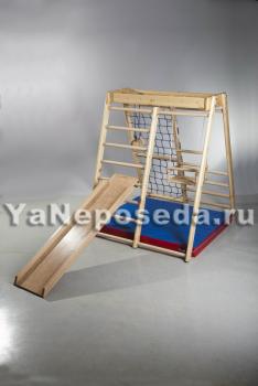 - Каркас комплекса изготовлен из сосны, перекладины шведской стенки и рукохода (на них идет самая большая нагрузка) из бука, гладиаторская сетка (полипропилен);