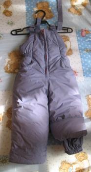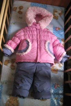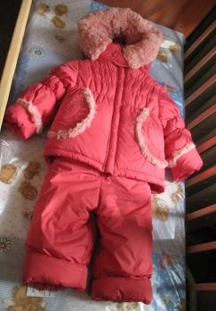 Куртка комбинезона застегивается на молнию, воторник-стойка плотно закрывает шейку. В куртке есть подстежка из натуральной овчины. Капюшон комбинезона внутри с очень мягким искусственным мехом отстегивается. Низ руквов, кармашки отделаны искусственным мехом. Полукомбинезон с резинкой по линии талии, лямки так же с резинкой, регулируются по длине. Низ рукавов и штанишек с широкими отворотами, что позволит носить комплект не один год.