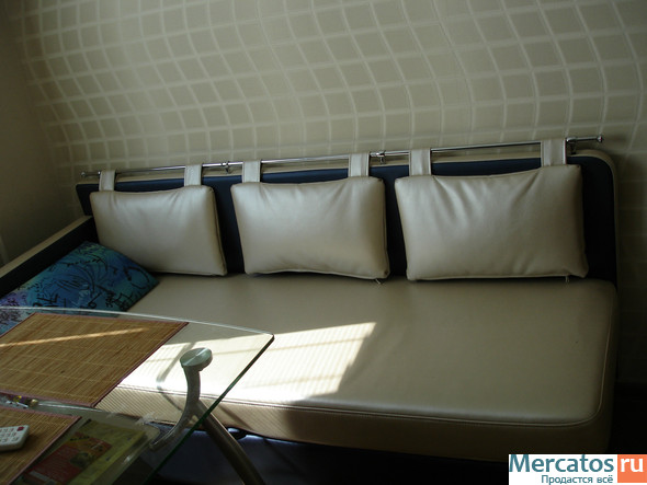 Отличный,2-х спальный диван, покрытый бежево-синим перламутровым кожзамом.Цена в магазине 30000 руб.