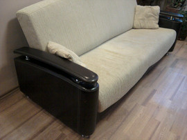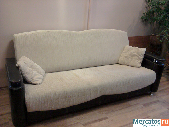 Продам диван с креслом. Цвет - светлый, крем-брюле. Кожаные подлокотники, подушки в подарок, диван книжка, 2-х спальный. Внутри вместительный ящик для белья. 2 года в эксплуатации. Возможен Торг.