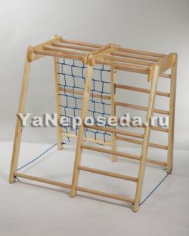 - Каркас комплекса изготовлен из сосны, перекладины шведской стенки и рукохода (на них идет самая большая нагрузка) из бука, гладиаторская сетка (полипропилен);
