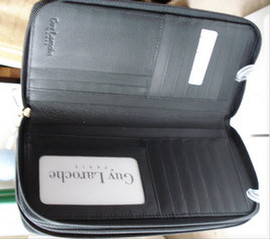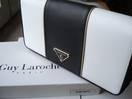 Дорожное портмоне GUY LAROCHE(Франция)из двух видов кожи - мягкой (черной) и кожи с тиснением (белой); состоит из 2-х больших отделений (каждое - на молнии: первое - для паспорта, для билетов и других документов, прорезные карманы для кредитных карт и пр., второе отделение для купюр, между ними - карман для монет на молнии; металлическая фурнитура - "золотая"; размер 10,5*19,0*3,5 см;