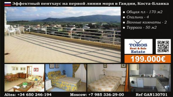 Продаётся эффектный пентхаус в районе Плайя де Гандиа. Огромная квартира на 8-м этаже с большой террасой 50 м2 с панорамным видом на горы. Общая площадь 170 м2, 4 спальни, 2 ванные комнаты, кондиционер (тепло/холод), отдельная кухня и большая гостиная с выходом на террасу. Апартаменты расположены в урбанизации с общим бассейном и садом. Гараж и мебель включены в стоимость. Цена 199.000€.