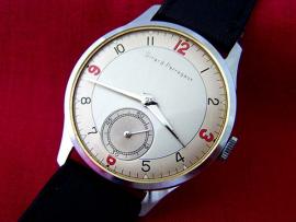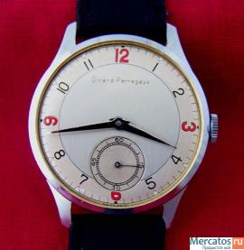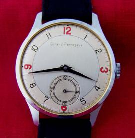 * Циферблат - Супер состояние; черные и красные арабские цифры; фон выдержан в золотистом и серебряном цвете; золотые часовая, минутная и секундная стрелки; маленький секундный циферблат на позиции 6 часов; Подписан ниже 12 часов - GIRARD-PERREGAUX, ниже 6 часов - SWISS MADE.