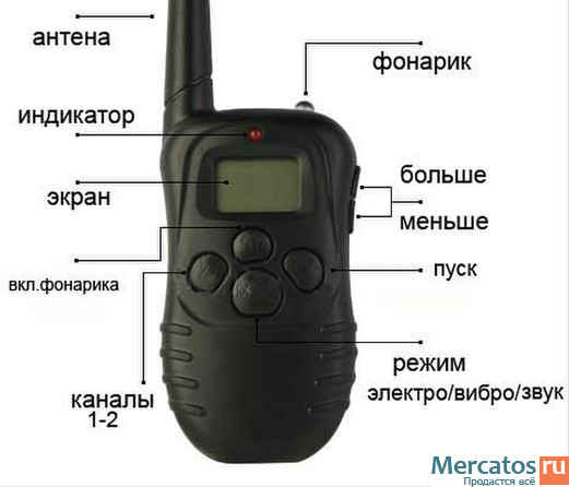 По командам с пульта приёмник действует на собаку вибрацией, электроимпульсами и звуком.