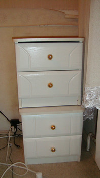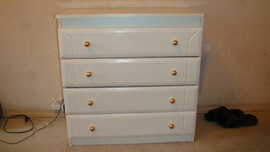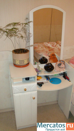 Комплект из 5 предметов в хорошем состоянии 3-х створчатый шкаф, 2 прикроватные тумбочки, туалетный столик, комод. Белого цвета.