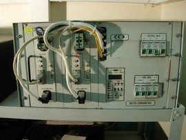 Блок коммутации системы электропитания включает в себя три шины (одна из них является внешней шиной потребителей и аккумуляторов, две других – внутренними: шина выходов выпрямителей ПНС и шина автоматических выключателей, обеспечивающих коммутацию напряжения и защиту от перегрузок по току как аккумуляторных батарей, так и основной нагрузки), а также плату телеметрии, позволяющую дистанционно передавать сигналы об аварийных ситуациях в системе питания, и до 2-х плат управления магнитными пускателями, предназначенными для защиты аккумуляторных батарей от глубокого разряда.