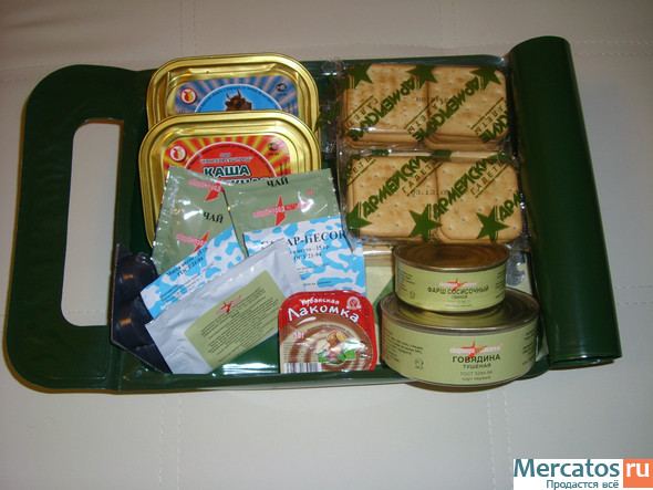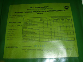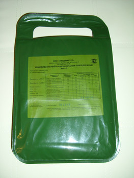 ИРП-П ТУ 9194-461-04605473-03 (с учетом изменений). Масса нетто-1,330кг. Масса брутто-1,600кг. Состав: хлебцы (галеты) армейские- 300г., консервы мясные-250г., консервы мясные фаршевые-100г., консервы мясорастительные разные-500г., повидло фруктовое-90г. или паста шоколадно-ореховая "кубанская лакомка"-50г., концентрат для напитка-25г., чай растворимый с сахаром-32г., сахар-30г., поливитамины (драже)-1шт., разогреватель комплект-1шт., салфетки бумажные-3шт., вскрыватель консервов-1шт.. Энергетическая ценность, ккал.:3369
