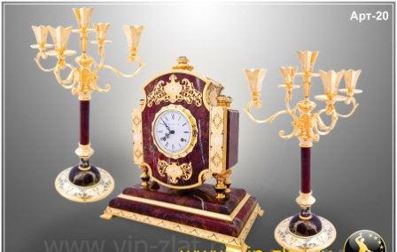 Часы "Каминные" выполнены из уральской пейзажной яшмы, обрамлены накладками из латуни, украшенной великолепным растительным орнаментом. В комплекте два подсвечника на пять свечей каждый. Часы "Каминные" созданы из яшмы, покрытие - золото, инкрустация горным хрусталем.