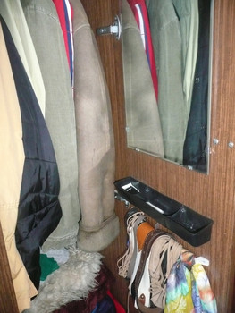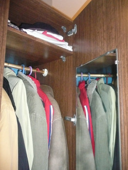 Размеры шкафа (выс, шир, глуб) 2м х 85см х 58 см. Внизу 2 ящика размером: 21 х40 х 58 (выс, шир, глуб). Внутри - полочка сверху и перекладина на всю ширину (85 см) шкафа. На правой дверце зеркало с полочкой для мелочей, а также поясов и галстуков.