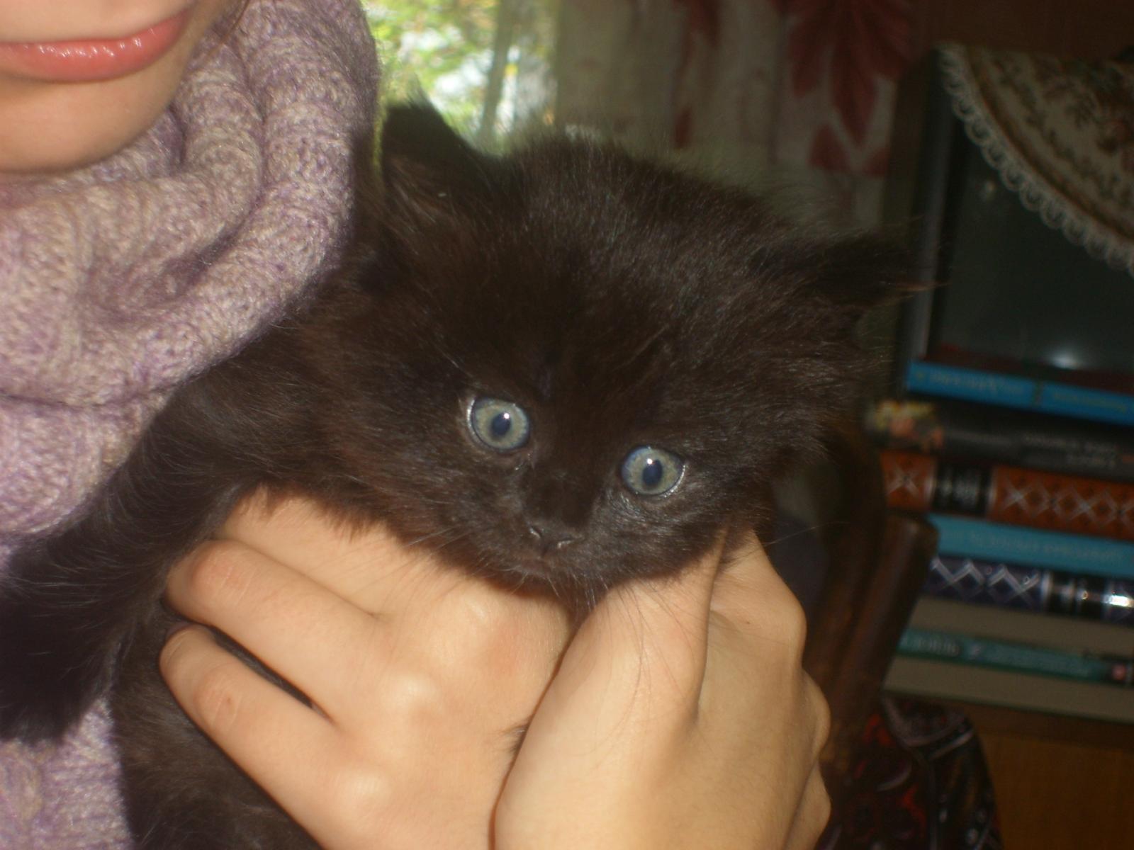 Котенок ищет новых хозяев.Девочка. Черная, с буро-серым воротником и животиком.очень пушистая, ватная, глазки желтые,2,5 месяца, очень активная, игривая, сильная. К лотку приучена, в еде неприхотлива. Родители здоровые, живут в одной квартире. Кот английский голубой, кошка метис сибирской с персидским, окрас черепаховый.