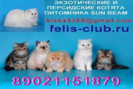 Котята экзотические короткошерстные и персидские.Питомник SUN BEAM предлагает красивых котят от титулованных родителей(все мраморо- и колоро-носители).Окрасы-белые голубоглазые и желтоглазые,черные силовые и черепаховые мраморные,колорики(ред-,крем-,сил-пойнты )экстремального и классического типа.Принимаем заявки на котят-при резервировании скидки от 10 %.Подробности по телефону 89021151879