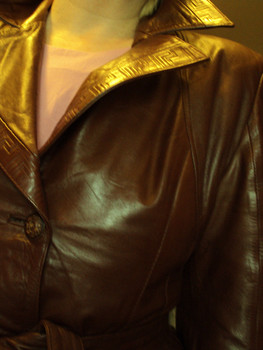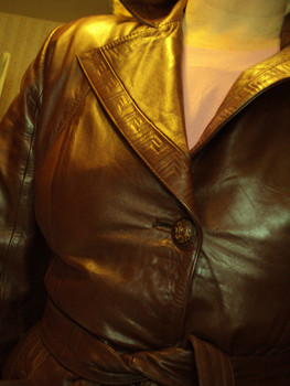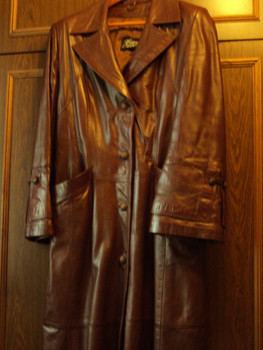 Женское кожаное пальто. Почти не ношеное. Состояние новой вещи. Цвет - красное дерево. Оригинальный орнамент отделки рукава и ворота. Длинное (см. фото). Возможна доставка.