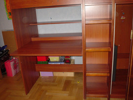 Столешница выдвигается, две полки для книг, вместительный шкаф с штангой для одежды и крючком. Длина=191см, Ширина=83см, Высота 170см С матрасом, спальное место 80*184см, реечное дно. Б/у в хорошем состоянии.