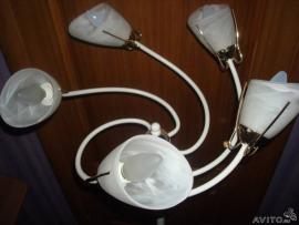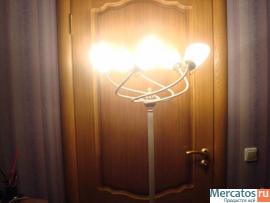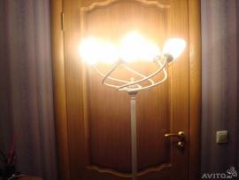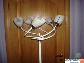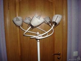 5 рожков. Материал:металл+стекло.(продаётся с лампочками,матовый миньон). Цвет-белый. Ножная кнопка включения. Высота-158 см.. Стильный дизайн. 6 месяцев. Отличное состояние!