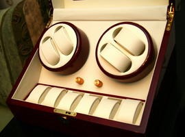 Продам новую заводную шкатулку для часов. автоподзавод четырёх часов, 6 ячеек для хранения. несколько программ вращения, отдельное(!) управление каждым ротором. питание от сети или от двух элементов АА.