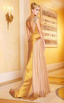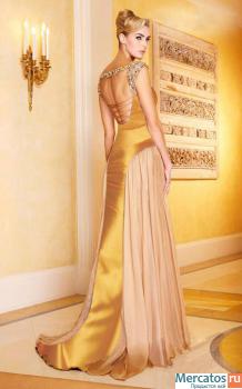 Новое шикарное вечернее/выпускное платье! Спокойные бежевый цвет легкого шифона, летящая юбка - очень романтичная сторона этого платья, а яркая вставка из золотого атласа, богато украшенный сложный вырез ворота и спина, а также шнуровка делают это платье по-королевски шикарным!