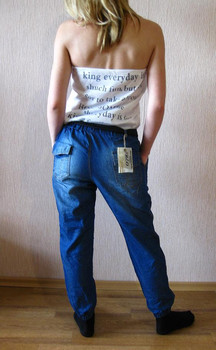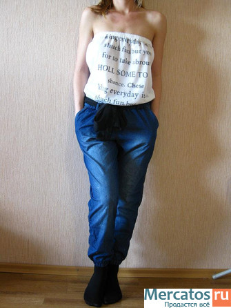 Низ джинсовый в низу на небольших свободных резинках. Стильный и красивый верх из белого шелка и мелкой сетки с надписью и стразами. Идеально сидит, подчеркивая фигуру. Производство фабричный Китай.