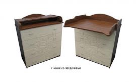 Пеленальный комод-трансформер.Каркас цвета шоколад,фасад ваниль-украшен красивым резным рисунком мультяшной детской тематики.Выс.97см.,шир.85см.,гл.45см.,в разложенном виде пеленальная поверхность 85на72см.,таким образом Вы сможете не только перепеленать малыша,но также размеров данной просторной пеленальной поверхности вполне достаточно для проведения массажа.Все края комода закруглены,полное отсутствие острых углов,а края пеленального столика дополнительно обработаны мягкой гибкой лентой.Имеет 4 вместительных глубоких ящика,выдвигаются ящики на направляющих-Немецкий механизм.В последствии, Вы сможете снять с него пеленальную доску,оставив гладкий верх и продолжать использовать данное изделие в качестве классического комода-для хранения детских и взрослых вещей и принадлежностей.Предоставляется гарантия и сертификат.Цена 3600 руб. Бесплатная доставка по Москве.