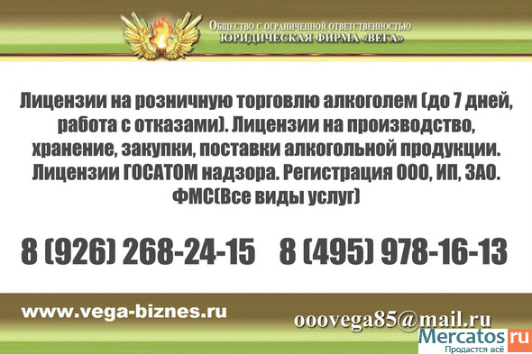 Лицензии на розничную торговлю алкоголем (до 7 дней, работа с отказами). Лицензии на производство, хранение, закупки, поставки алкогольной продукции. Лицензии ГОСАТОМ надзора. Регистрация ООО, ИП, ЗАО. ФМС (все виду услуг).
