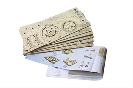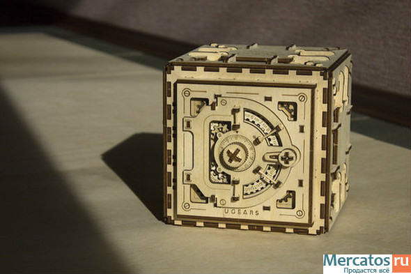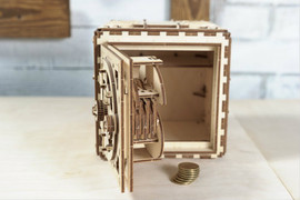 Сейф собирается без клея, в нем нет ничего кроме деревянных деталей и резинок - части конструктора плотно крепятся друг к другу, а резинки выполняют роль пружин и пусковых элементов. Готовые модели работают исключительно за счет механики.