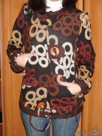 Почти новый пуловер интересного фасона. Асимметричные карманы и большие круглые пуговицы. Есть капюшон. Горловина может затягиваться. Рукава и подол тоже на затяжках. 44 – 46 (M)
