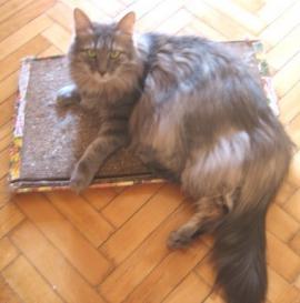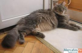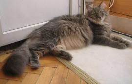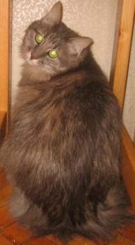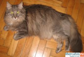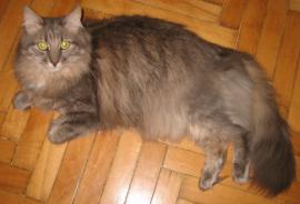 Похож на норвежского лесного, серый с бежевым окрасом шерсти, с ниспадающей шерстью, роскошным хвостом, вытянутой мордочкой, кирпичным носиком, крупного телосложения.