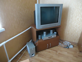 Угловой письменный стол, тумбу под ТВ – 1.5 тыс, 2 тумбочки по 1 тыс., журнальный столик – 1.5 тыс и 2 кресла (ПОЭНГ ) из IKEA – по 1 тыс., ключевой сейф для дома (вес около 40 кг) – 2.0 тыс., цифровой телевизор Philips, диагональ 72 см, частота развертки 100 Гц - 3.5 тыс, монитор LG 17” – 1.0 тыс