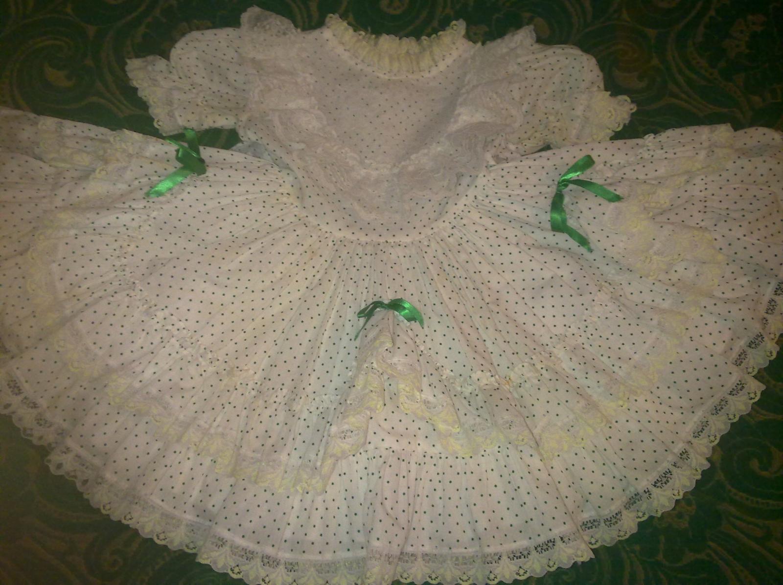 из батиста на 3 года Нарядное белое в зеленый горошек платье с зелеными бантиками (украшение) и желтоватым кружевом, длина от плеча до пояса - 23см, до подола - 55см., изнутри еще одна юбка для пышности. (Много материала и ручная работа) Цена 300 руб