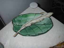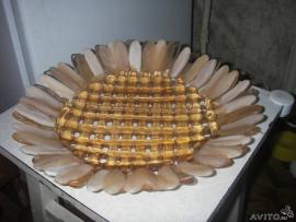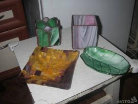 Изделия из стекла ручной работы. Прекрасный подарок на любое торжество. Блюдо-поднос 2000 руб, тарелка-фруктница 1500, Тарелка-мозаика 700, тарелка-лист 400, подсвечники по 650, перо - 150 руб.