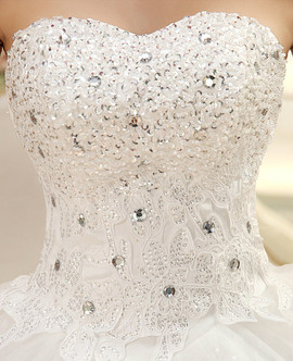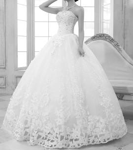 Слегка заниженная талия. Очень пышная юбка из многослойного фатина. Верхний слой - кружево " Ришелье". Платье без шлейфа.Юбка так же расшита стразами и паетками.
