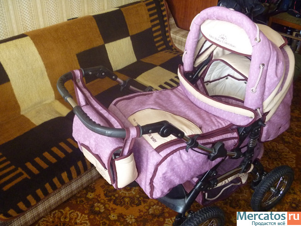 Материалы верха коляски легко поддерживаются в чистоте (легко снимаются и стираются в машинке). Коляска выполнена из 100% хлопчатобумажной ткани с водоотталкивающей пропиткой. Тент на трещотке. Перекидная ручка. Пружинная амортизация люльки. Съемные колеса на шинах с подшипниками. Сумка для мамы. Вместительная cетка для продуктов. В комплект входит москитная сетка, дождевик. Коляска в хорошем состоянии, пользовались аккуратно.