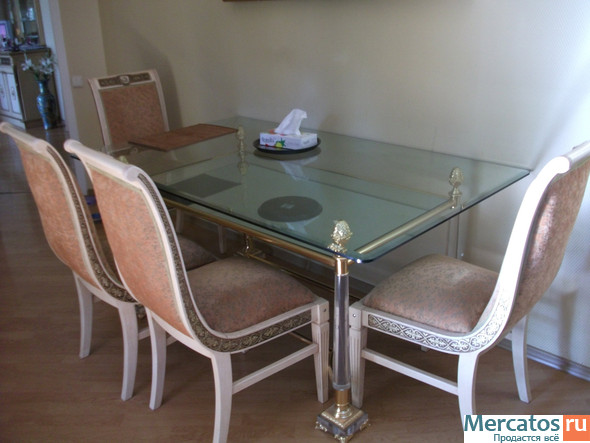 2) продается красивый стол для большой кухни или большой гостиной ( ширина 1200х2320длина)+4 стула+ 2 кресла в подарок, производство ОАЭ, состояние идеальное.