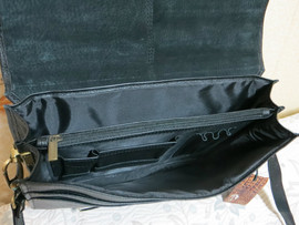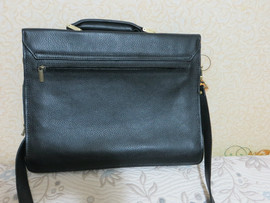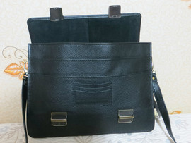Натуральная кожа, качественная выделка. Черный цвет. Размер 36 * 28 см. Ширина дна 11 см. Много функциональных отделений. Съемный ремень.