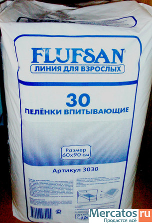 Продам пелёнки впитывающие для взрослых Flufsan, артикул 3030, размер 60x90 см, 2 упаковки по 30 шт. в каждой. Цена за упаковку 300 руб.