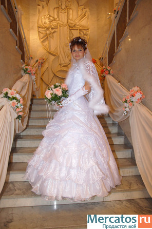 Свадебное белое платье, р-р 42-44, подол пышный с обручами, сзади прямой, корсет на шнуровке. В стоимость входит также фата, накидка, перчатки.