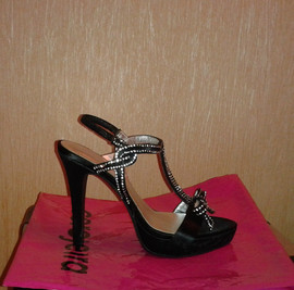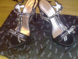 Подаю туфли-босоножки LIU JO, одевала 1 раз для фотосессии, следов носки нет, родные набойки, в фирменном мешке. Текстильный материал, стразы, черный цвет. Сзади на резинке, высота каблука 11,5 см, высота платформы 2 см. Очень удобная колодка.