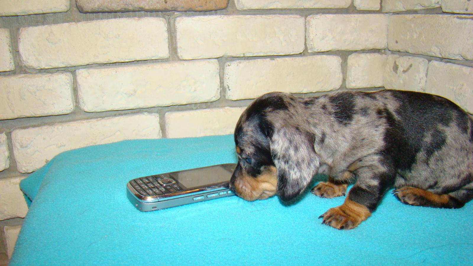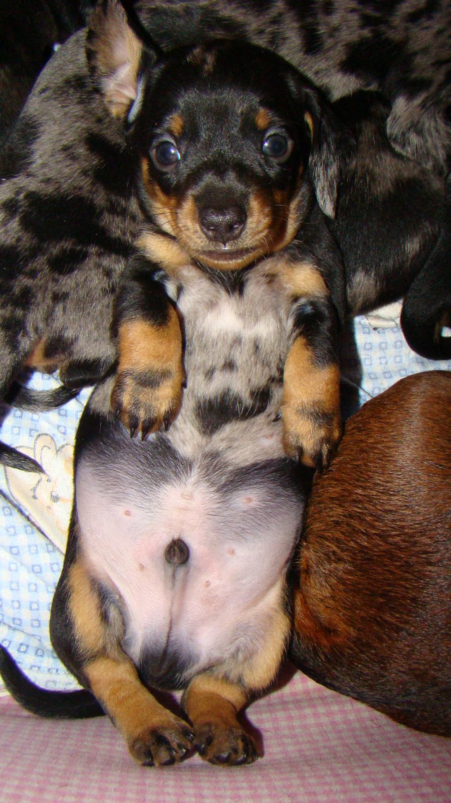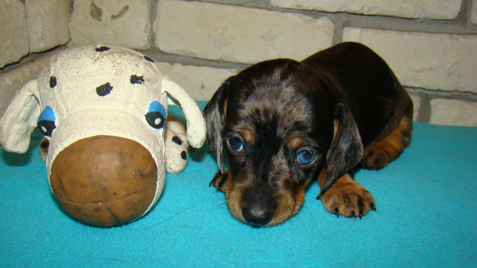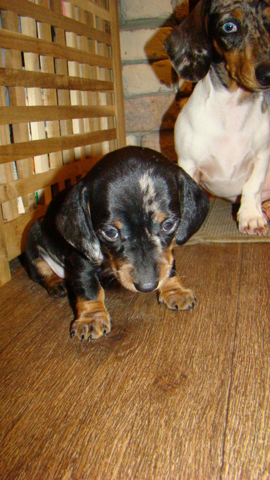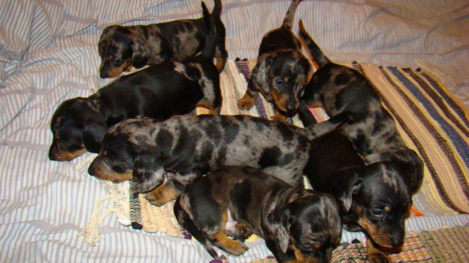 Продаются элитные щенки кроличьей гладкошерстной таксы с родословной РКФ -3 девочки и 4 мальчика-чёрный и серый мрамор, д.р. 28.08.2010г.