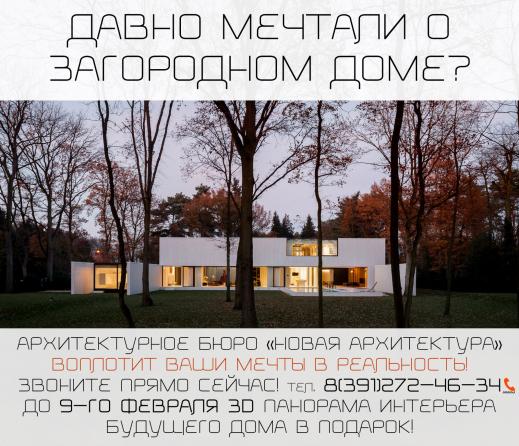 Архитектурное бюро «новая архитектура» воплотит ваши мечты в реальность! Внимние! До 9-го февраля 3D панорама интерьера будущего дома в подарок! Звоните прямо сейчас! тел. +7(391)272-46-34