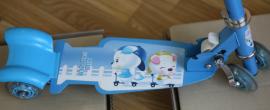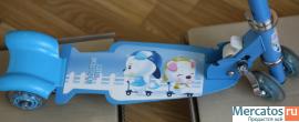 Самокат детский, голубой с рисунком на подножке «медвежата», четырехколесный (колеса каучук, маленькие, при движении светятся огоньки), устойчивый, немного б/у, в хорошем состоянии. Регулировка по росту с 2-х до 4-х лет, ножной тормоз на задних колесах.