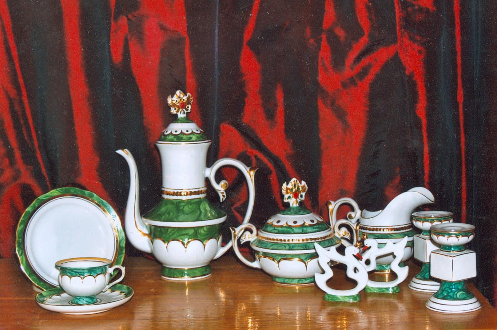 Удивительные предметы, часть из которых включают государственную символику, обработанные особыми красителями (под малахит) и золотом, напоминают царские фарфоровые предметы.