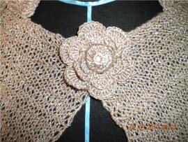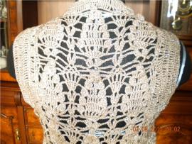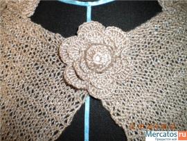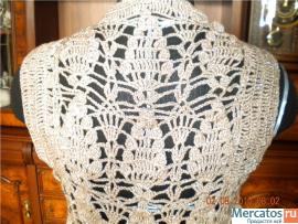Жакет ручной работы выполнен из качественной пряжи. Размер 40-42 Пряжа с люрексом. ( серебряная нить). Длина около 60 см. На спине оригинальный узор. Спереди закалывается на брошь (вязанный цветок) Без торга.